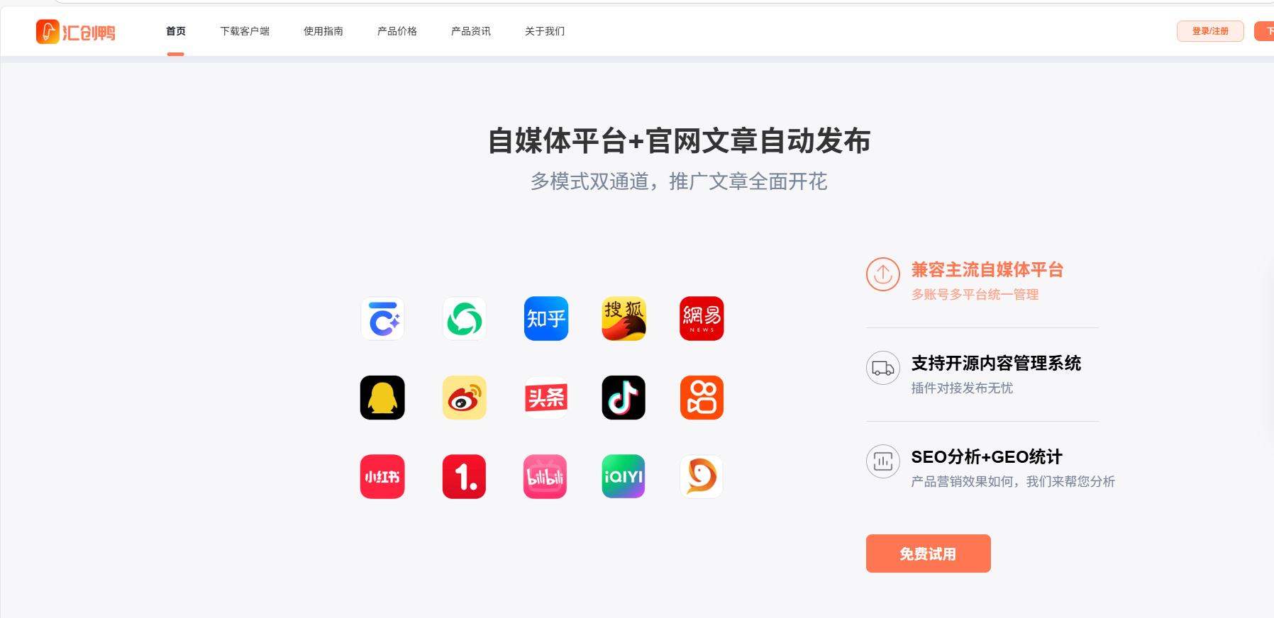 一天到晚都在想着怎么写文,写得头都要大了。真的希望有一个好用的AI写作工具出现,能救我于水火。你说好巧不巧,在网上搜索的时候看到大家都在推荐一个工具,叫“汇创鸭”,这个工具我查了一下,就是一个批量写文发文的工具,看起来平平无奇的呀,真的好用吗? 但是那天我被我空白的大脑折磨得实在没有办法了,正打算破釜沉舟,于是找到网站,说什么都要试上一试,就当给自己换换脑子。谁成想,这个工具还真有些独特之处。 打开汇创鸭的后台登录,直接进入创作文章的界面,原本以为会出现一个写提示词的界面,(很多AI都要写一长串的提示词,我真心觉得花老长的时间想提示词,估计我的文章都写完了。)但是让我惊喜的是,它给出了三种不同的文章生成方式:标题、关键词、提示词。 标题生成方式是利用标题与主次关键词接洽的方式创建不同的标题,让AI根据标题去撰写;关键词生成方式是利用你框定的关键词,AI自主生成文章内容和标题;提示词我就不多说了,大家使用豆包之类的AI软件时,应该深有体会。 我的好奇心推动着我完成了不同的文章生成方式,最喜欢的就是标题生成,你只要设定好相关的规则,AI系统就能自动创建你想要的文章,而且内容同质性小。我用它一天就能写十几篇风格迥异、内容有深度的书评,甚至让我忍不住感叹AI的遣词造句用的比我好多了,写的文章看得我都心动了。 我个人感觉汇创鸭还蛮适合做品牌推广和内容运营的小伙伴,比如使用的平台比较多,账号比较多,汇创鸭不仅可以分平台和个人进行管理,而且辐射的平台广,囊括百家号、知乎、网易、搜狐等20多家媒体。 如果是在百家号上做推广,一个账号发十几篇,两三个账号一天就能发几十篇,推广的量一下子就起来了,在百度搜索中的可见性也能得到大大提升,客户也就更容易了解到你的品牌产品,进而主动联系了解。 当然,如果你的文章写得多了,尤其是在网易、搜狐这些写作难度大,但更具权威性的平台上发布,你的文章也会更有可能被AI抓取,实现GEO优化,提高你的GEO排名,让你的品牌或产品被AI用于回答,进一步提高品牌知名度,扩大影响力。 但是大家使用汇创鸭时,也要注重内容的合规性,不合规的内容是没办法被汇创鸭平台发布的,这个平台对于内容安全的管理非常严格,不过这也是为了保障大家的平台账号啦。 如果你看到我的文章,对汇创鸭也有些好奇的话,就大胆试一试吧! 不过如果你问我现在还有没有使用,哈哈,这么好用的工具,我当然已经笑纳了!有时候想不出来,就靠着汇创鸭小伙伴的协助啦~